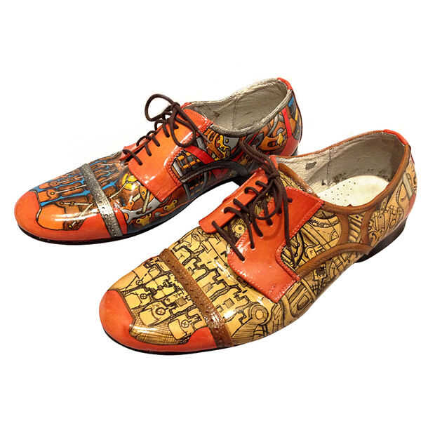 Hace un tiempo me compré un elegante par de zapatos de baile de cuero blanco (de lindy hop y blues, si debes saber). Bailarín torpe que soy, dentro de unas pocas noches que mis zapatos estaban cubiertos de manchas y marcas de desgaste. Un geek menor podría sólo haber limpiado los zapatos, o tal vez decidió dejar de patear gente en la pista de baile. En cambio, decidí pintar ambos zapatos con un diseño complejo, por lo que cualquier rayado sería menos imperceptibles. ¿(Reparación de calzado creo es la mejor izquierda a profesionales? Lo que una carga de viejos zapateros!)