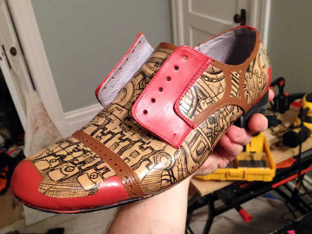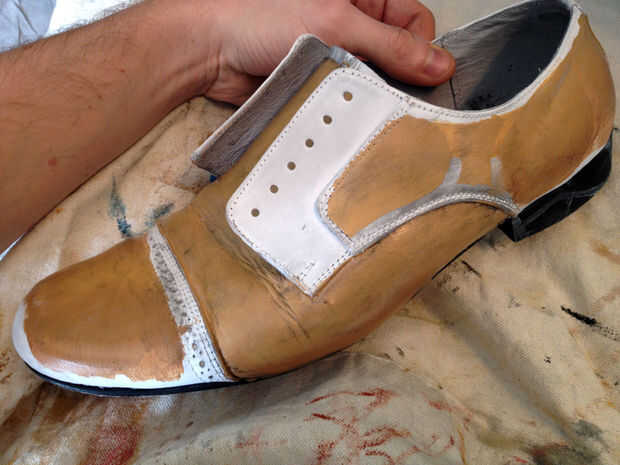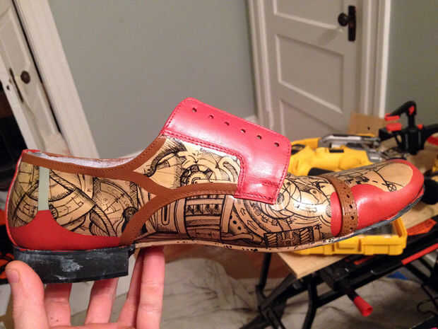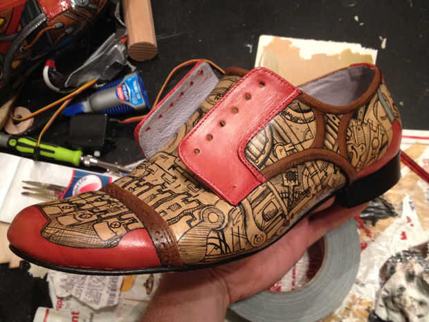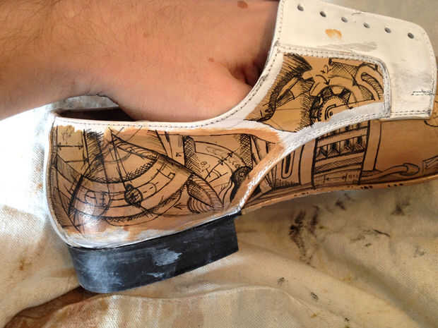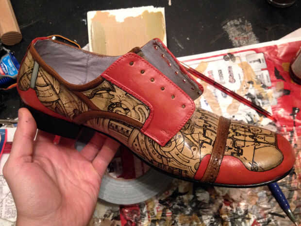 que utiliza una técnica un poco diferente, más rápida para mi segundo zapato. Quería darle este zapato el aspecto de los bocetos que había sido utilizado para diseñar el mecanismo interno del primer zapato. Empecé pintando una capa base de distintos marrones y algunas manchas negras, para crear una textura de papel envejecido. Luego usé una brocheta de madera para dibujar cuidadosamente en la parte superior esta en negro, antes de añadir colores vivos y toques de luz sutiles y sombreado para que coincida con el otro zapato.