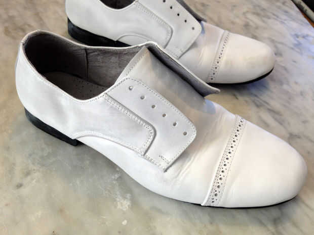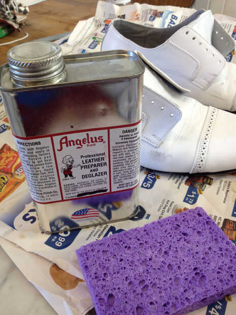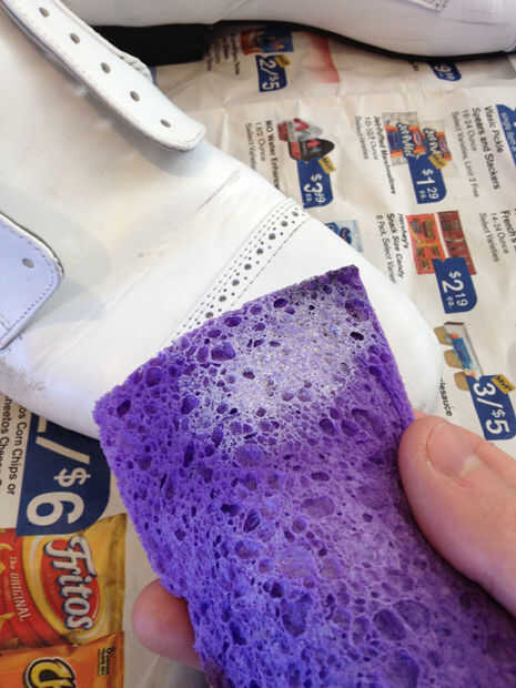 En primer lugar, quitar los cordones. Aplicar deglazer un poco en la esquina de una esponja y esponja en tus zapatos. Inmediatamente notara una diferencia en su superficie el acabado se retira. En este caso, usted también puede ver algunos de la tintura original saliendo en la esponja. Repetir este proceso por toda la superficie de ambos zapatos.