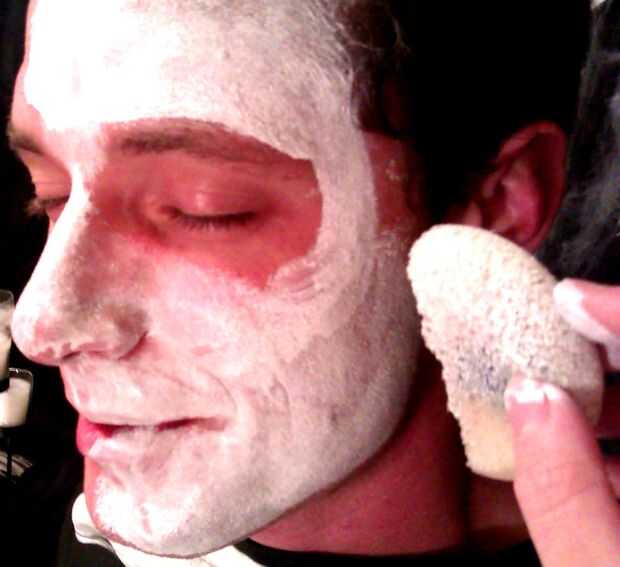 2. conseguir una buena cantidad de pintura saturada en la esponja. 3. Frote o limpie la pintura con la esponja alrededor de la cara incluyendo labios.