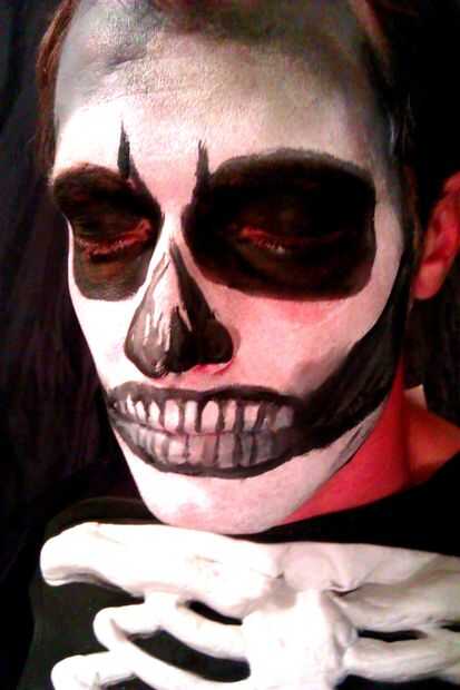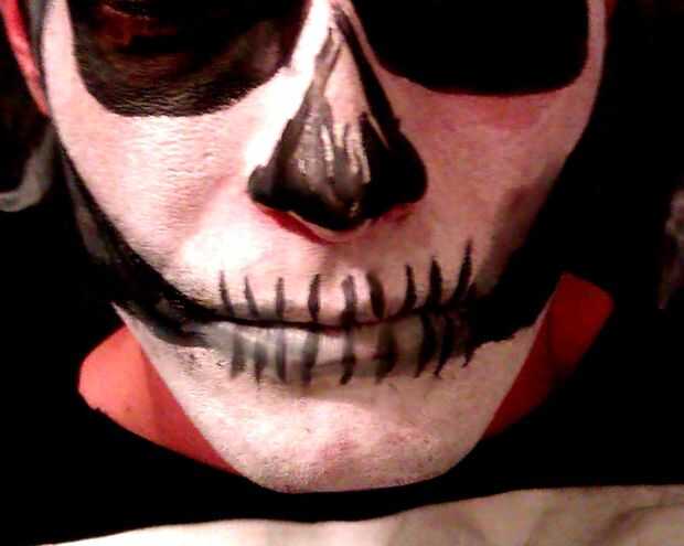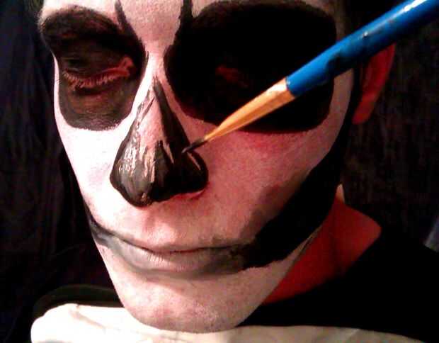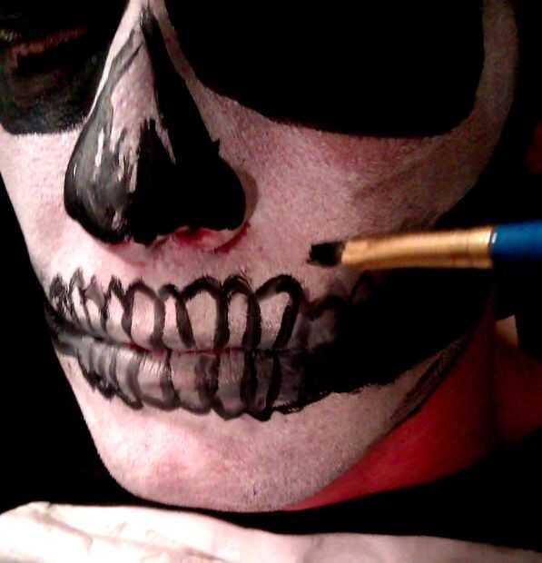2. dibujar líneas verticales en los labios ligeramente espaciados para indicar los dientes. Utilice el pincel más pequeño. Ayuda a tener una mano firme para esta parte mientras se aplica lentamente las líneas negras finas. Si las líneas son un poco inestables como la mía que está muy bien. (Recuerda siempre secar su cepillo sobre toalla de papel si la pintura parece demasiado que moquea).