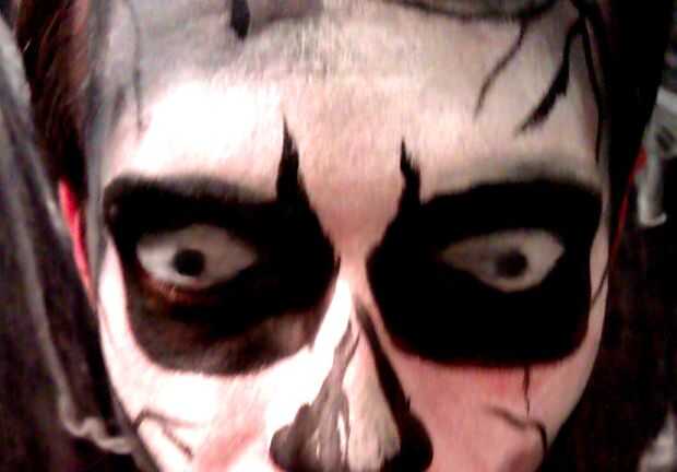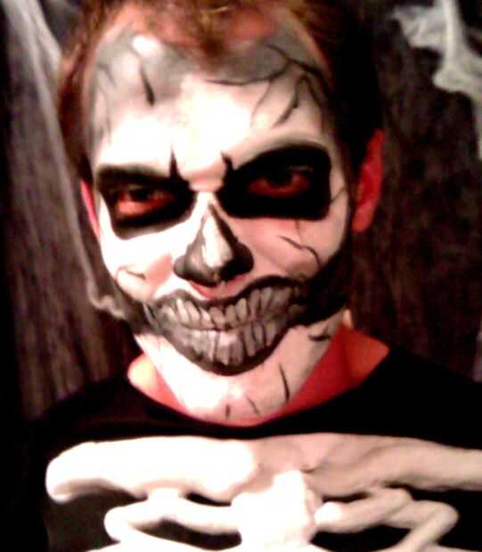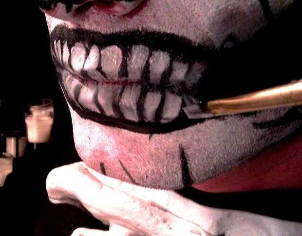 (Opcional: hacer los ojos mirar sangre tiro.) Esto se logra con pintura a base de agua color rojo y amarillo. Con su cepillo, dibujar líneas irregulares con pintura roja desde el exterior del párpado pintado hacia la pupila. Usted puede mirar una imagen de las venas del ojo como referencia si es necesario. Usted puede Agregar las venas amarillas y una pupila amarillo para hacer que los ojos parezcan aún más miedo.