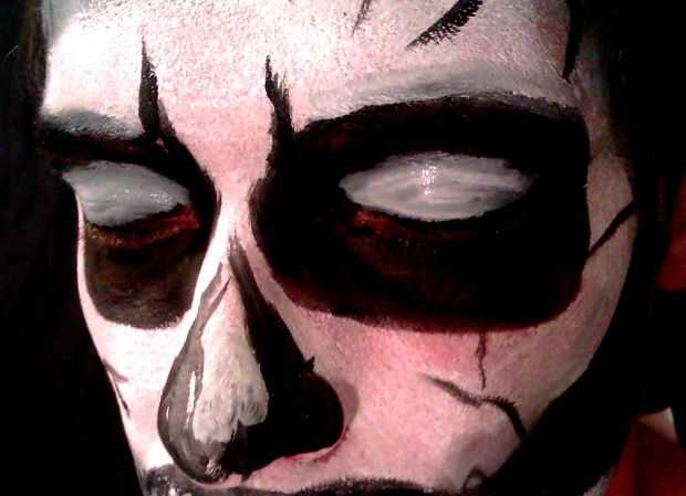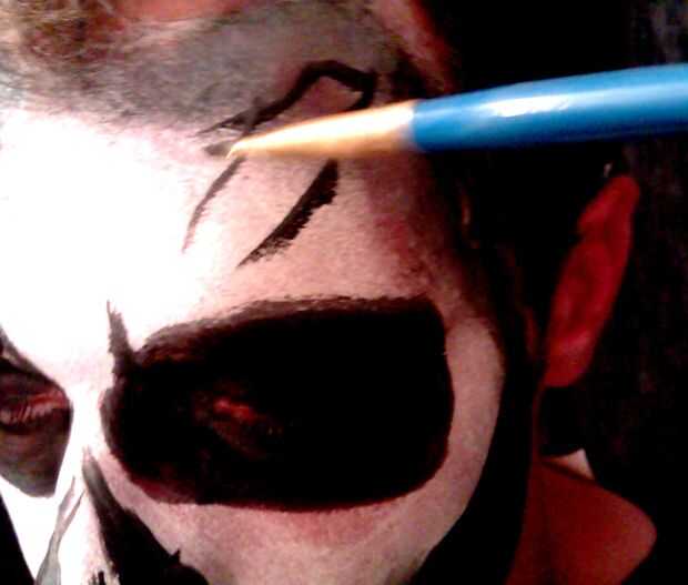2. utilizando el pincel mediano o pequeño, añadir pintura blanca sobre los ojos. Se trata de una forma ovalada que cubre el párpado. Tenga cuidado de no conseguir la pintura demasiado líquida por lo que no funciona en los ojos de los sujetos.