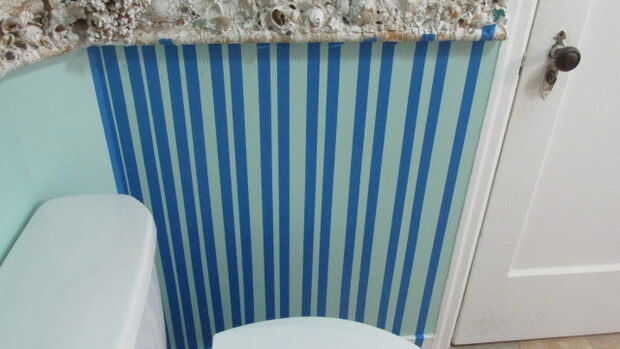 Láser en cada marca de lápiz y seguir línea con cinta de pintor.  Mientras estaba trabajando en esto y cambié de opinión y decidió ampliar gradualmente las áreas de pintura mientras se mueve a través de la pared. Esto que espero drama de ad.