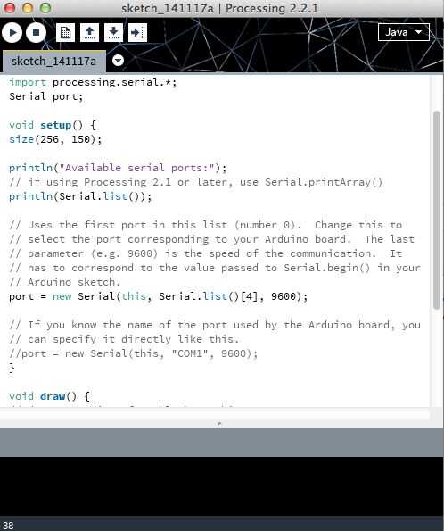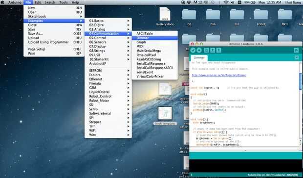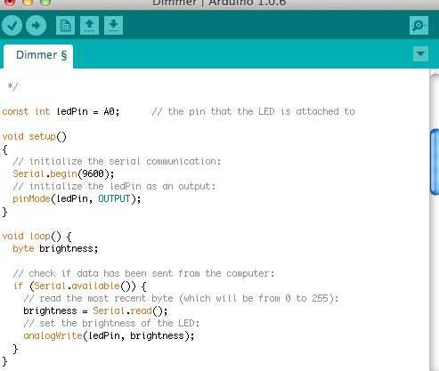 Utilizo el ejemplo dimmer en el Arduino. El ledpin por defecto es 9. Porque conecto mi luz a A0, lo cambio "ledpin = 9" a "ledpin = A0". Continuación, pulse cargar. Entonces la luz es ahora blink! Después de eso, copio el código de procesamiento a procesar, por lo que puedo controlar la luz mediante el procesamiento.