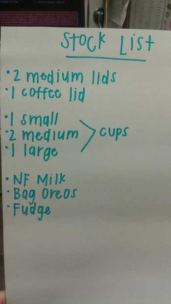 • Debe haber suficiente stock seco tales como tazas, tapas, servilletas, etc. disponibles en el frente durante al menos 24 horas.
