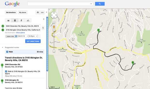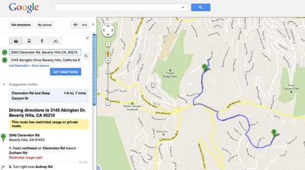 Paso 2: haga clic en "Obtener direcciones" y su dirección de partida y destino. Estoy usando mi mapa para obtener direcciones entre las casas de mis dos actrices favoritas, Paris Hilton y Kim Kardashian.