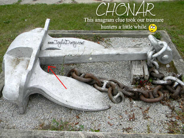 La pista conduce a este ancla grande abajo en el parque de la ciudad podría haber hecho muchas maneras diferentes. Por ejemplo tal vez una rápida poco rimar por ejemplo... cuando la nave en la bahía, le ayuda a permanecer o si tuvieras más jóvenes cazadores del tesoro, quizás podría dibujar un cuadro de un barco o imprimir uno y dibuje una flecha en el anclaje.