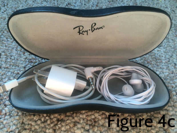 • Utilizar una vieja caja de vidrios para guardar cargadores y auriculares (Figura 4 c)