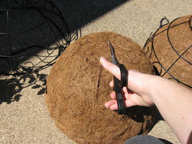 Con unas tijeras muy grandes, cortar un agujero en forma de "x" en la parte inferior del revestimiento del coco. Esto es más duro les parece, al menos es si usted es mujer. Intente colocar el corte para que el cesto lo apoyará más tarde si es posible.