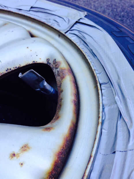 Usando la cinta de su elección (cinta es más ancha mejor), cinta de sus neumáticos y la válvula de aire. Algunas personas simplemente spray sobre el neumático, corte y retire el exceso de goma. Hacer lo que quieras aquí. Me gusta grabar fuera.