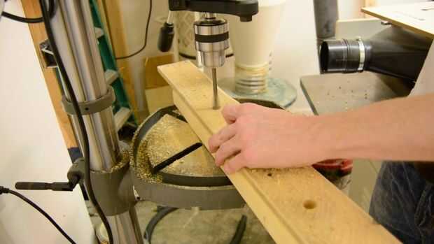 Para el tablero de fondo que pudiera sostener las copas taladré agujeros de 5/8 con una broca de pala. Hice una marca de 2 1/4 pulgadas de los soportes verticales y luego espaciados los agujeros sobre cada 4 pulgadas. Luego usé mi plaza de combo para dibujar una línea desde el borde exterior de los agujeros al frente de la Junta. Luego corté las ranuras utilizando mi rompecabezas.