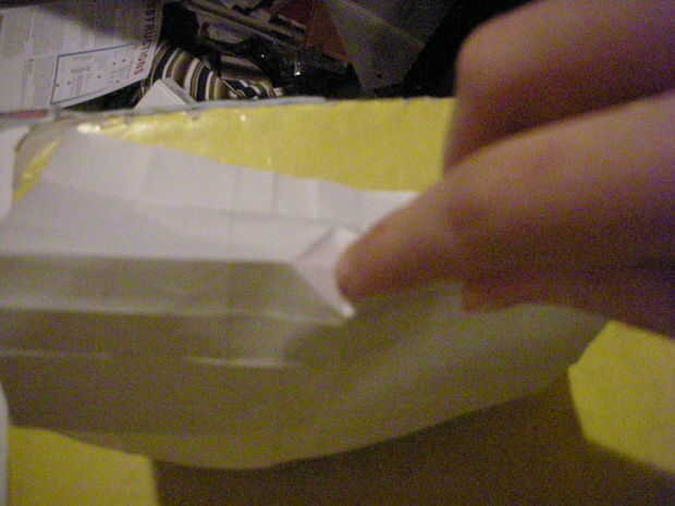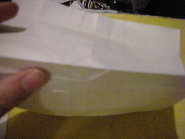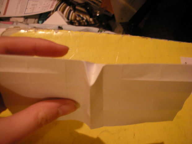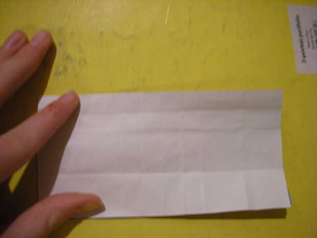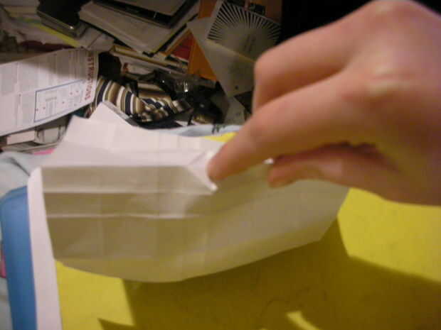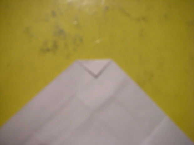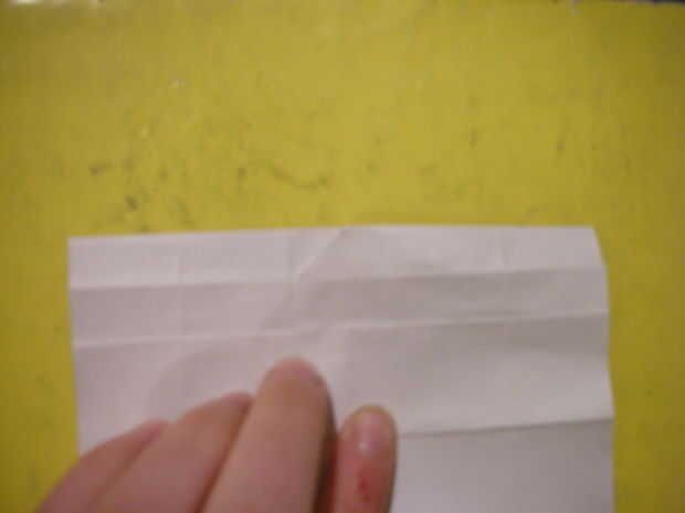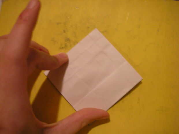 Ahora, un poco abrir el papel y mira el diamante en el centro. Muy, muy cuidadosamente, empújela hacia abajo con el dedo para cuevas sí mismo. Asegúrese de que sólo el diamante cuevas. Ver las fotos para más detalles. Si se hace correctamente, el documento todavía será doblado por la mitad y sobresaldrán dos líneas de los lados del diamante. Presione hacia abajo para que tengas una especie de barra en la parte superior de su rectángulo.