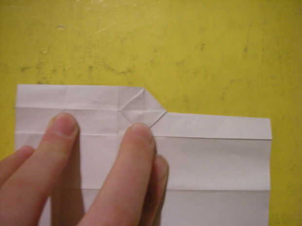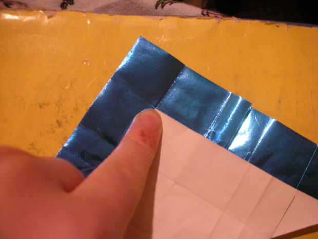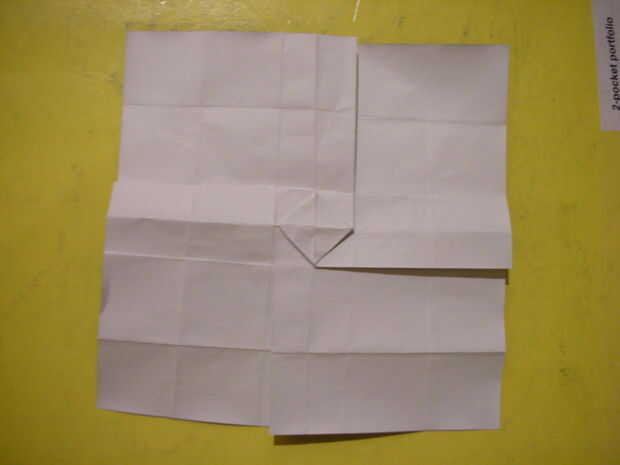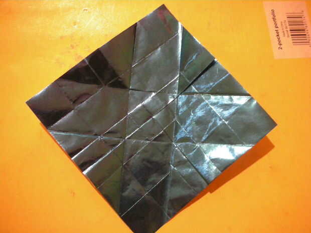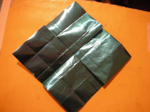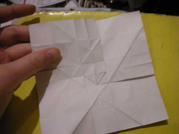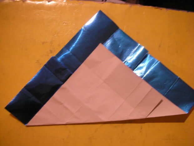 Voltee su papel para que el lado coloreado quede frente a usted. Arreglar el papel por lo que es un diamante, luego doble una esquina hacia la esquina opuesta, parada debajo de la esquina del diamante superior (ver fotos). Pliegues bien y repita para las cuatro esquinas hasta que hay un cuadrado en el centro con "caminitos" hacia él.