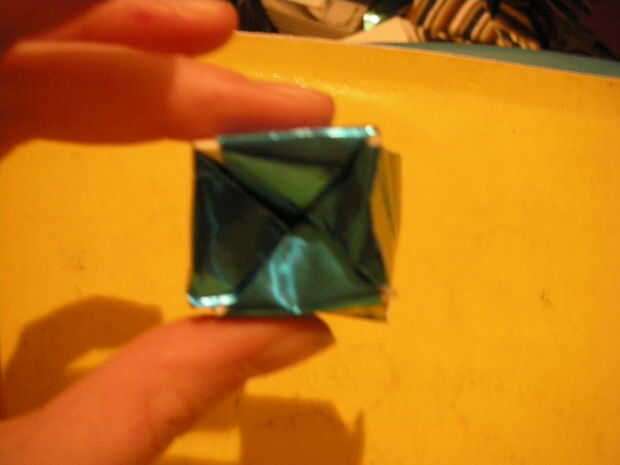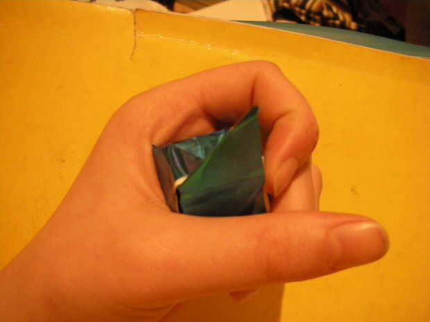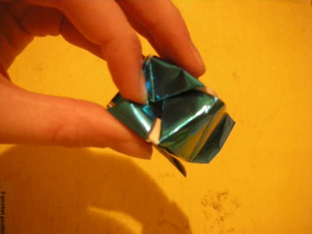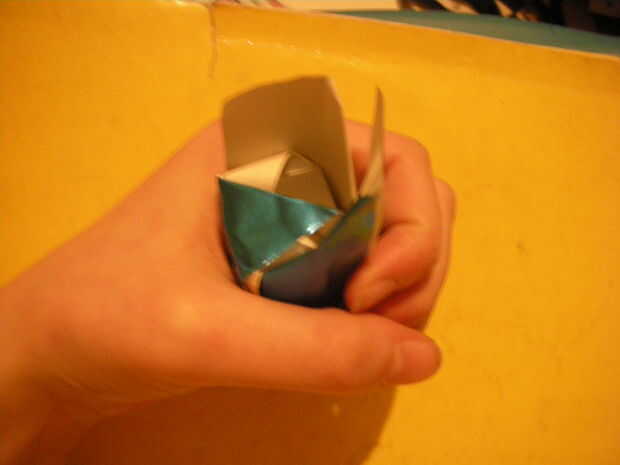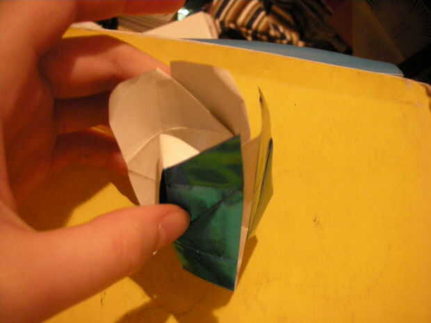 Usted quedará con una caja con un remolino en la parte superior. Hacia el interior de la caja, para que pueda ver el blanco, doble hacia abajo la primera solapa. Se formará a una especie de forma de triángulo sobre la aleta a su lado, a la vez formando un triángulo en la abertura de la caja. Haga lo mismo con cada aleta, para que forme una "fijación" caja de triángulos que se superponen. Al llegar el último triángulo, vaya por debajo de la primera. Esto efectivamente detendrá de apertura y arruinar tu hermosa rosa.