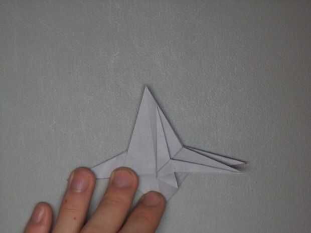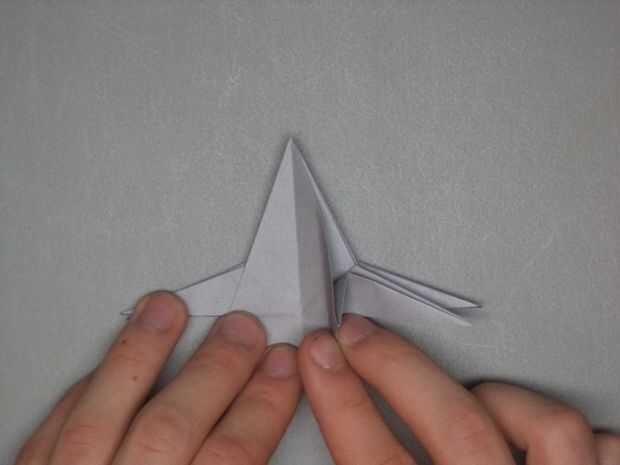 Doblar hacia adentro los dos bordes opuestos como se muestra en las fotos. Esto debe hacer parte de las alas a doble naturalmente hacia abajo. Una vez esto terminado en ambas mitades del caza estelar, doblar la parte inferior como se muestra en la última imagen. Voltee el papel y repita en el lado opuesto.