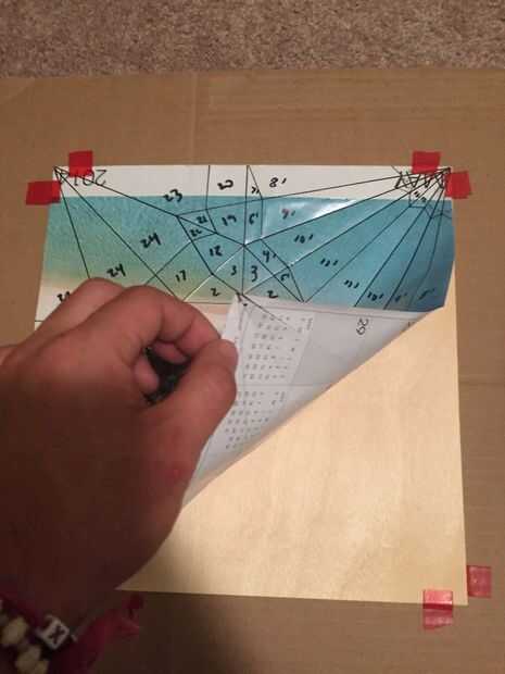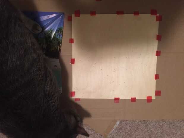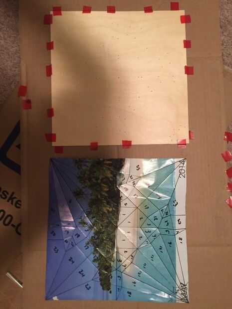 Firmemente con cinta adhesiva la cartulina (grabado dos capas, por si acaso) a una hoja de cartón. Alinee con cuidado el papel por encima de este. Con una chincheta/marcador, hacer un agujero en cada intersección de líneas. Tan cuidadosos como intentado ser, terminé faltan algunos, pero fácilmente puede realinear su plantilla al sustrato con otros dos alfileres. Cuidadosamente utilizando su sustrato como guía, trace el diagrama de doblez en la cartulina. Si se observa desde el otro
