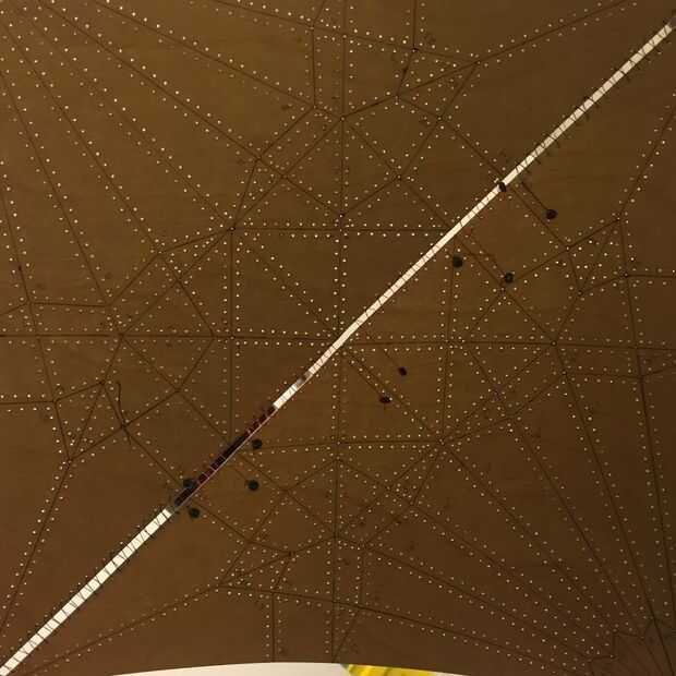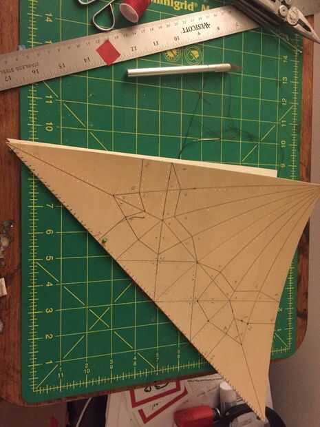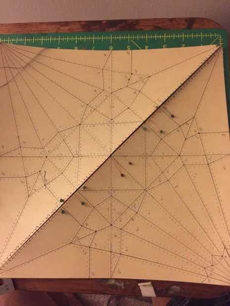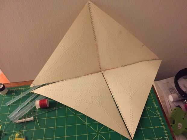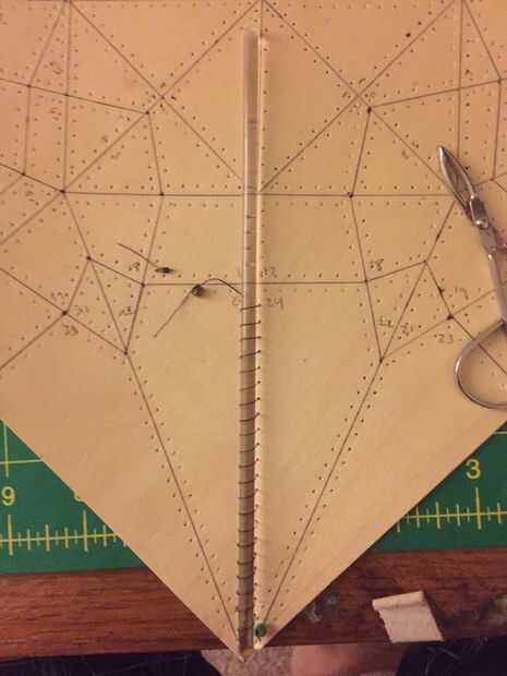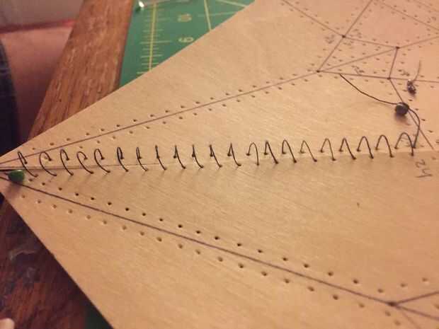 Utilice una regla y Xacto para cortar sólo un segmento de línea a la vez (es decir, no la diagonal completa, pero sólo la parte cosida en fotos 2 y 3). De esta manera nada es siempre. Enhile el sedal a través del primer agujero hasta sólo un poco seguía siendo por un lado y el pegamento caliente se. Con el fin de asegurarse de que un 'pliegue' tenía flexibilidad, cosí alrededor de una varilla de vidrio pequeña, aunque más tarde me cambié a un palillo, que me ha gustado mucho mejor. Enrolle el hilo a través, teniendo cuidado de no enganchar o enredo, una hazaña que se hace exponencialmente más difícil que el proyecto va en. Al final del segmento de línea, todo lo apriete con un par de pinzas, luego agregar un poco de pegamento caliente en el otro lado.
