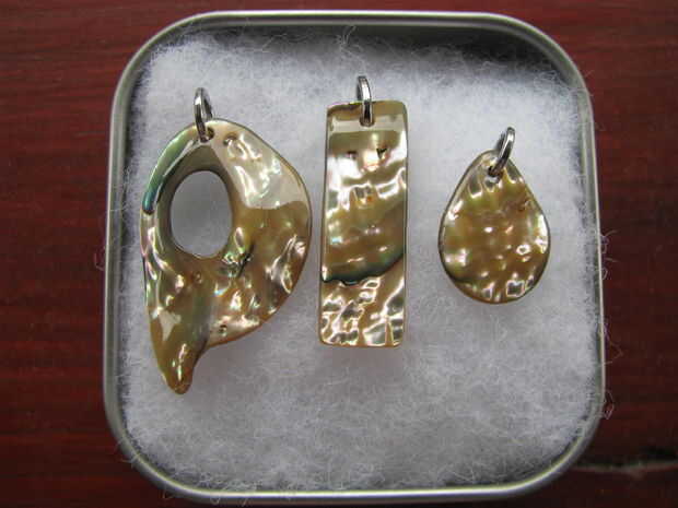 hasta hace poco pensé todas conchas de bala fueron hechas de bronce. Al parecer también puede encontrar las cubiertas de la cáscara de acero. Reducir esta cubierta de .45cal, los orificios perforados y montar un pedazo de concha de abulón pulida en é