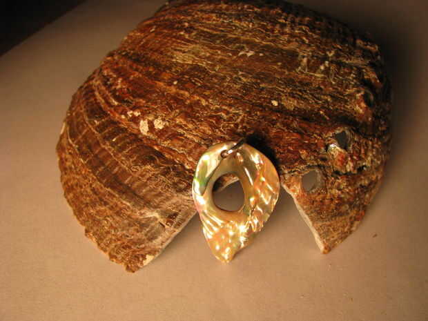 abuelo de mi esposa pasó años recogiendo conchas de mar y la costa de México. Un día que le dio a mis hijos una caja de esas conchas. Esta cáscara del cowrie particular cayó a poco de las manos y se rompió por la mitad. Tan naturalmente, hice colgant