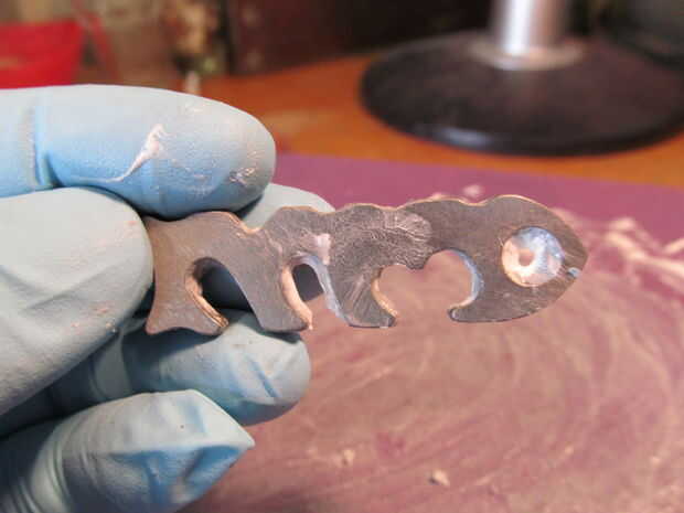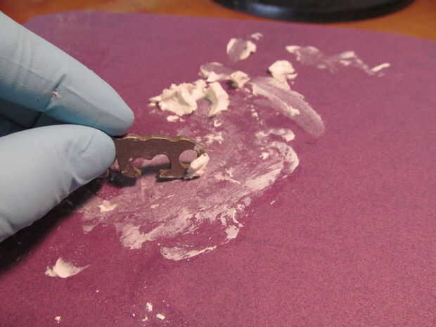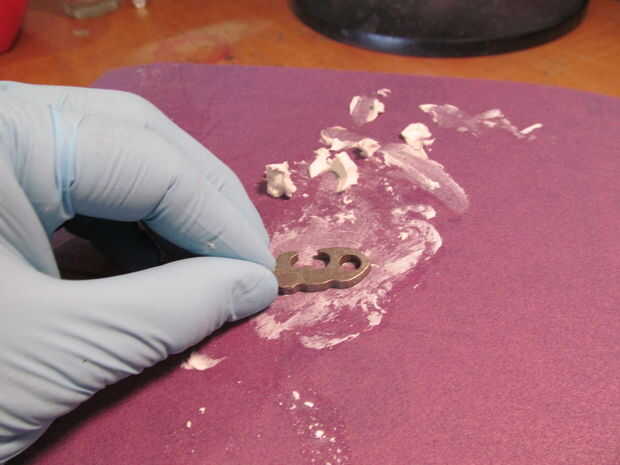 Toma una hoja de papel de lija 220 y colóquela, lado rugoso hacia arriba, sobre una superficie plana. Estoy usando un bloque de vidrio. Aplicar un pulidor de metal para el papel de la arena. Meguiars hace diversos grados que hace que las cosas van más rápido. Para este paso estoy usando corte heavy metal polaco. Deje algún pulimento extra sobre el libro así que usted puede "cucharada" más medida que avanza. Frote la pieza con un movimiento circular. Finalmente se sentirá una diferencia en cómo se siente el metal contra el papel. Esto es porque la superficie del metal se está convirtiendo en una textura uniforme contra este grano. Preste atención a dónde estás poniendo presión. La cabeza y la cola iba más rápido debido a cómo estaba sujetándolo. En cualquier caso sólo pasé unos 45 segundos en esta arena (y cada otro grano).