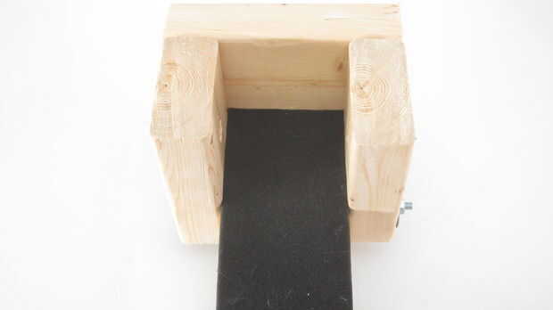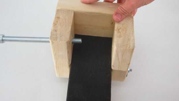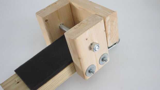Ahora tenemos que colocar el perno de 1/2" que actuará como un mango. Inserte el 1/2" tornillo a través de los agujeros de 1/2" en los dos tableros de 5". Atornille la tuerca de 1/2" en el extremo. No apriete demasiado o se deforman las piezas laterales.