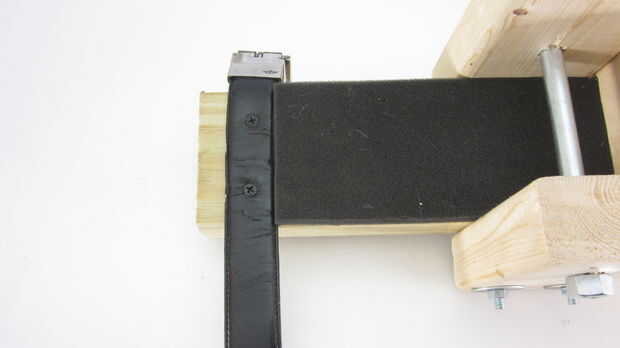 Vamos a colocar la correa a la Junta Directiva de 11 1/4" con un par de tornillos. Así perforé dos agujeros guía de 3/4" a cada lado de la Junta. Luego hice los agujeros en el cinturón para que coincida con los agujeros en el tablero. Por último tornillo de 1" largo madera tornillos a través de la correa y en la Junta.
