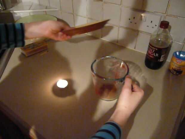 Retire la tapa e incline la jarra sobre la vela. (No echar el líquido sobre la llama)