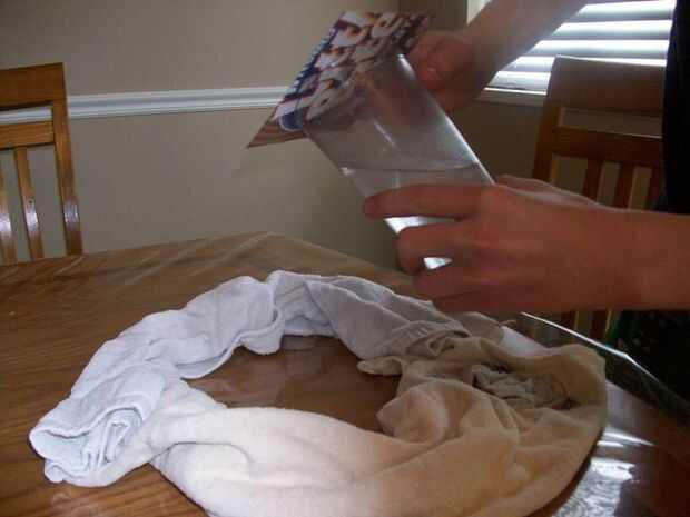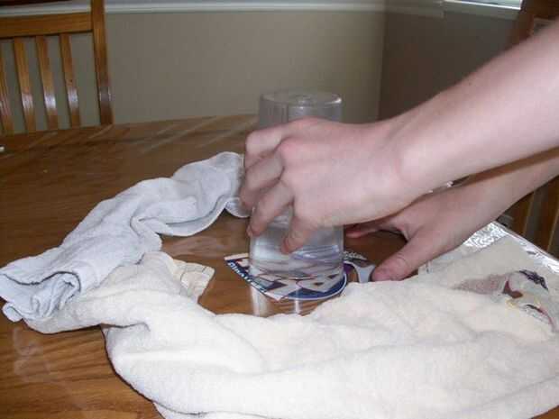 Poner el pedazo de cartón delgado en la parte superior (Asegúrese de que hay un sello en la cartulina) y voltee la Copa.  Si usted tiene toallas, colocarlas alrededor del lugar donde vas a poner la taza.