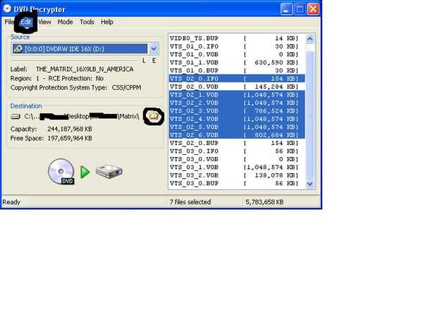 Instalar los programas. Entonces decrypter dvd e inserte el dvd. luego haga clic en editar y haga clic en lo que dice archivos de película principal Seleccione a continuación, seleccione el directorio que desee guardarlo pulg. y haga clic en el cuadro grande del dvd. Esto le llevará un tiempo.