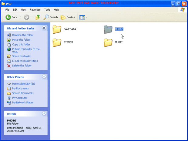 Ahora, el equipo debe mostrar las carpetas dentro de la carpeta llamada PSP como en cuadro 1. A continuación, arrastrar y soltar la carpeta con el nombre de la foto - con sus imágenes-en la carpeta llamada PSP, el que está viendo.