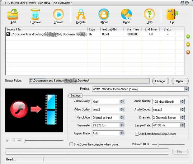después de descargar todo esto, es hora de abrir su convertidor de flv. Haga clic en agregar y seleccione el archivo FLV que desea convertir. vaya a los menús desplegables y seleccione WINDOWS MEDIA VIDEO .wmv y el resto de los menús deben cambiar automáticamente. elegir el destino para tu escritorio (sólo cuz es fácil de encontrar el archivo). Usted puede cambiar a otra configuración también, como la calidad y esas cosas, pero de mayor calidad es igual a archivos más grandes. Ahora haga clic en convertir.