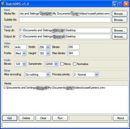 AHORA convertir su .wmv a .dpg. abrir batchdpg y haga clic en abrir en el archivo de los medios de comunicación de entrada. dejar el archivo de subtítulos. para la salida, seleccione escritorio para temp y la salida. (las otras cosas deberían cambiar automáticamente). Ahora, haga clic en agregar y luego ejecutar. ahora esperar que se complete la conversión.