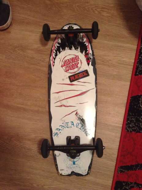 este es el segundo luge de la calle que he hecho. Los camiones se toman de un patín de $9, y he añadido viejas ruedas de roller-blade en ellos. Mi original va hasta 25 millas por hora, y creo que este va a ser la misma. (yo no puedo montarlo, ya que