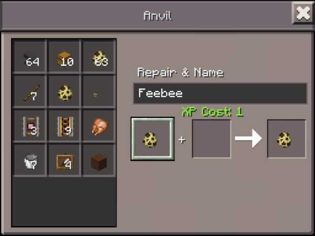 Después de ajustar por la prensa de "Yunque" en él como lo haría si estuviera a punto de trabajar en una "mesa de elaboración". Usted verá 4 cajas en tu pantalla y tu inventario. Ya está destacando la primera casilla tan, pulsa sobre el huevo en tu inventario. Se establecerá en la primera casilla. Ahora habrá una caja encima de los otros tres. Pulse en él y poner un nombre o de otro título. Después de pulsar hecho verás un huevo en la tercera caja. El coste para él es 1 XP. Pulse el huevo en la tercera caja x 2 para poner en tu inventario.