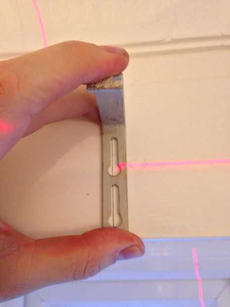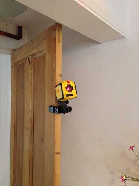 Para encontrar el nivel horrizontal usé mi nivel de láser Stanley Cubix. Me esta había montado en la puerta y disparó el láser a la ventana. El uso de este lo hace todo el trabajo mucho más fácil. Si no tienes uno es bastante fácil de utilizar un nivel normal y cinta métrica.