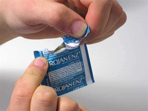 Mirar en las esquinas de la envoltura del condón. Debe haber una pequeña ranura en el lado del paquete. Corte a lo largo de esta línea y rasgar un lado entero del contenedor. Hacer este paso con los dedos y no con los dientes ya que no quiere romper el condón.