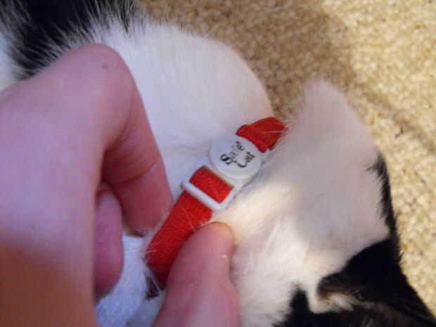Nota importante de seguridad: a menos que seas una persona realmente horrible, asegúrese de que el collar es lo suficientemente flojo como para no ahogar a su gato.