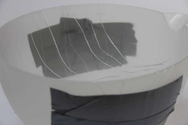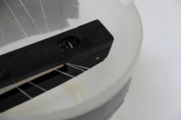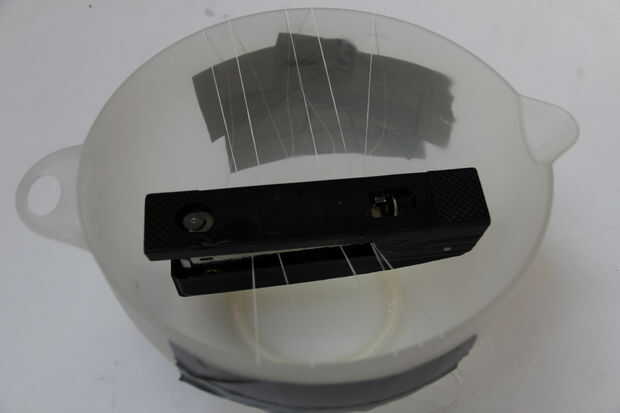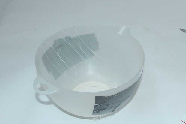 Para crear la suspensión para la grapadora, cortar unos trozos de hilo dental que son tiempo suficiente para envolver alrededor de su molde. Cinta estas bien a lo largo de los lados, permitiendo un poco de una holgura por lo que la grapadora no se tocarán alguno de los bordes del contenedor. Asegúrese de que sólo con cinta adhesiva la parte externa de tu molde. Este paso lleva tiempo y paciencia (y tal vez la ayuda de algunos otros cómplices), así que colgar en allí.