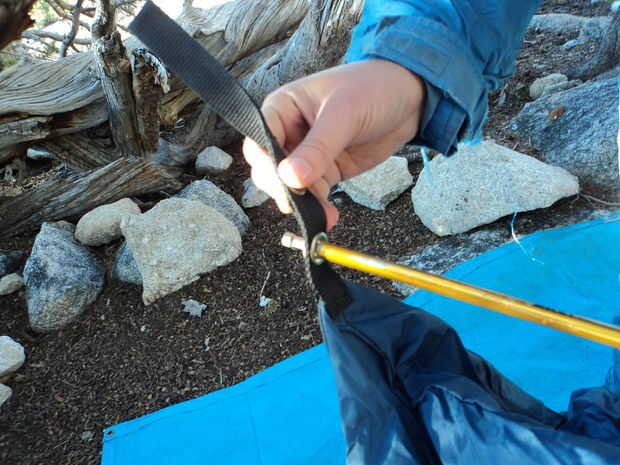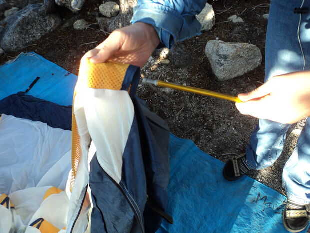 Sus postes de la carpa pueden attache un poco diferente pero generalmente debería haber algún tubo de la tela para los postes de la carpa se deslice a través.  Acople un extremo de los polos al borde de la tienda.  Nuestra tienda dispone de ojales que los extremos de los polos.