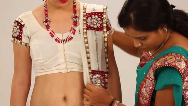 Cómo ponerse un sari con pliegues finos perfectamente y cuidadosamente en los siguientes cuatro pasos-Uso un sari de la gasa o del georgette para este método, use una blusa de manga larga. Meta el extremo de la sari (no pallu final) en el lado derech