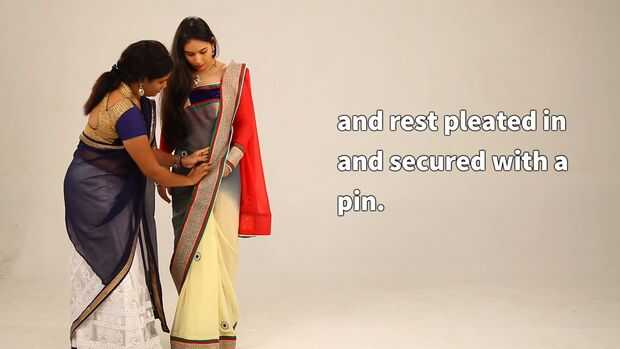 Retire el pasador de pallu y ajustar los pliegues manteniendo la frontera recta pin junto con la blusa en el lado derecho del pecho. Para ello, que el pecho se cubrirá con sólo una capa de tela y descansen plisado en y asegurado con un alfiler.