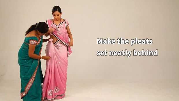 Para una explicación detallada ver el video de YouTube arriba.Marathi estilo drapeado sari -Usar un sari de algodón de seda para este método. Usar shorts en vez de inskirt para esto.Mantenga la sari detrás de la persona. Tomar un extremo sobre la cin