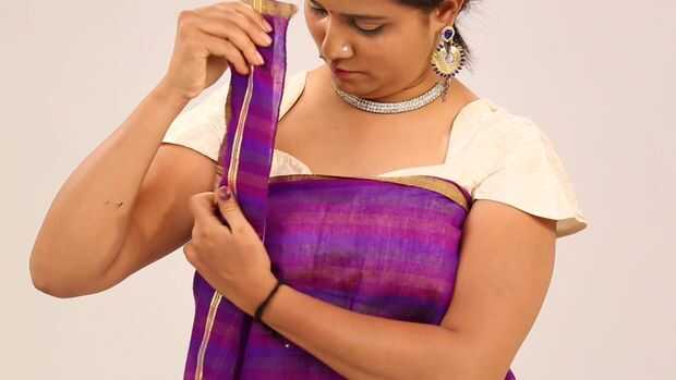 Drapeado de la sari sobre traer al frente, traer el pallu sobre el mantenimiento del hombro izquierdo se corta simplemente aplastar la tela y dejar. Ahora coge el pallu, llevarla sobre el pecho debajo de los brazos y el extremo corto sobre el hombro derecho de adelante hacia atrás y fijarlo con un alfiler.