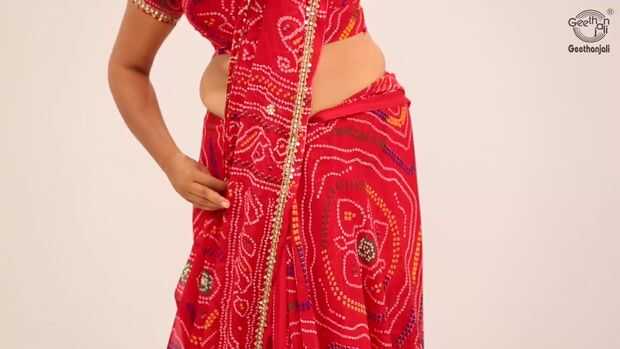 Sari de Rajasthani estilo drapeado - proceso paso a paso-Usar un sari bandhini (corbata y colorante material), para este método.Meta el extremo de la sari (no pallu final) en el lado derecho y llevarlo alrededor de la cintura a la parte posterior, tu