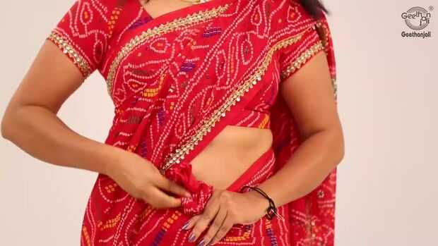 Sari de Rajasthani estilo drapeado - proceso paso a paso-Usar un sari bandhini (corbata y colorante material), para este método.Meta el extremo de la sari (no pallu final) en el lado derecho y llevarlo alrededor de la cintura a la parte posterior, tu