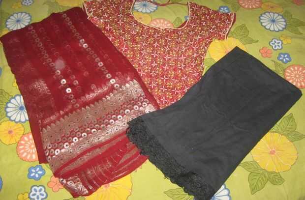 Seleccioné un sari rojo y una blusa con el trabajo de la secuencia y una enagua negra