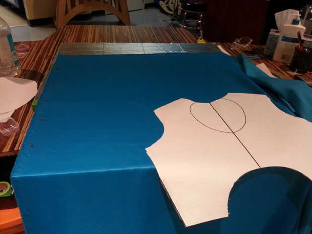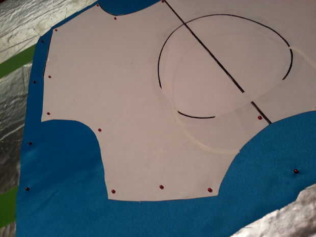 6. Si usted tiene cualquier marcas que deben rastrearse en, quitar las patas que serán a tu manera (pero deja lo suficiente para mantener la tela hacia abajo), e inserte el papel de calco entre la tela y el patrón.