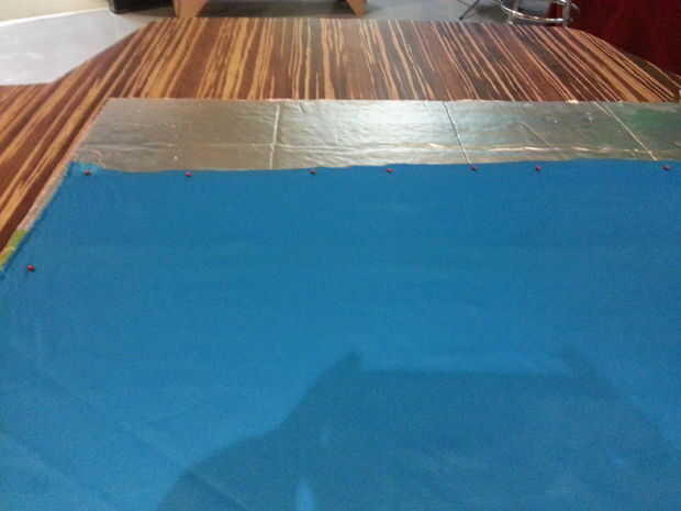 2. Tome a la tela y encontrar su borde de orillo. Línea para arriba con el borde de la Plaza, esquina a esquina e Inserte los pernos a lo largo de cada lado. Puedes poner las clavijas en un ángulo para asegurar que van en todo el camino, de lo contrario la tela puede viajar hasta el perno y distorsionar todo. Asegúrese de suavizar cualquier arrugas y protuberancias como vas.