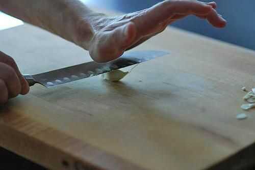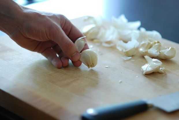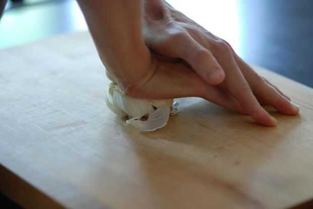 La piel externa de los dientes de ajo es papel y no para comer - por lo que necesitan ser removidos. Después de machacar el bulbo más grande con la palma de mi mano para separar los dientes, pela el ajo de dos maneras: puse lo de mi navaja en un el clavo de olor y presione hacia abajo en la hoja hasta que el diente aparece y libera la piel. O cortar el tallo clavo casi completamente apagado, saliendo de la piel unida. Bien, cuando apriete la piel en el otro extremo del diente el diente pelado generalmente sale derecho.
